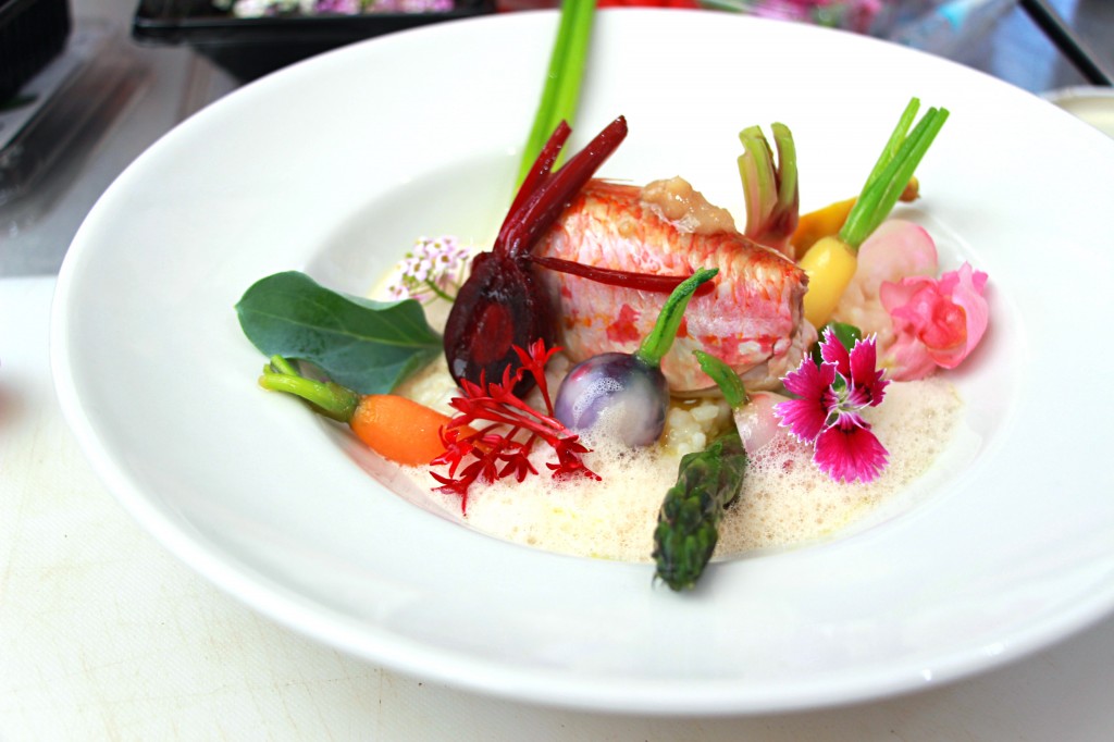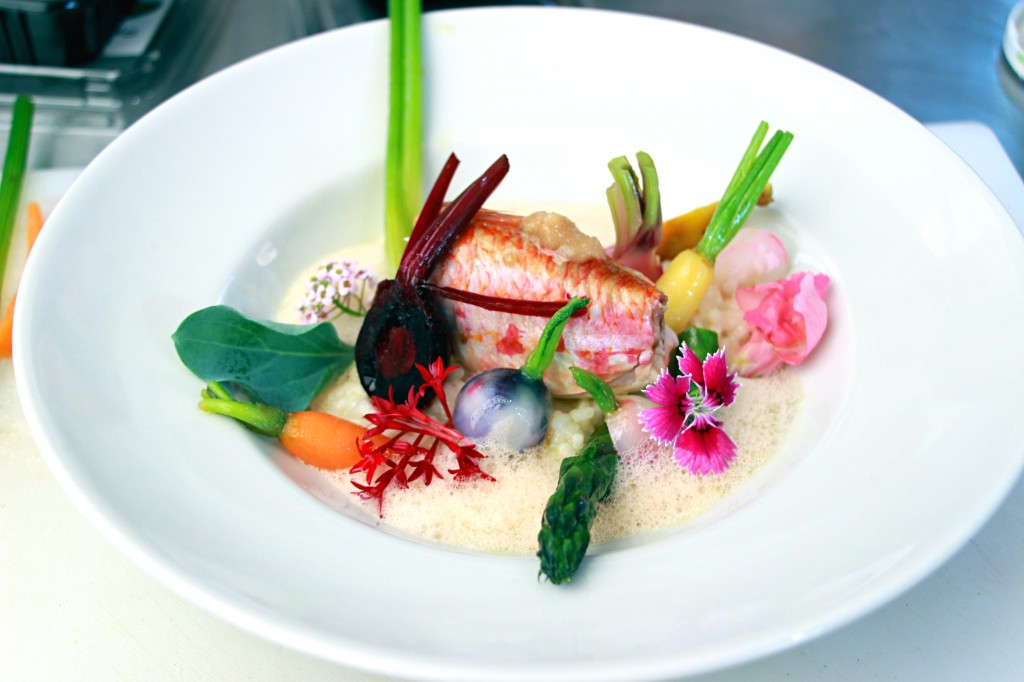 La recette qu’il nous a proposée est vraiment une recette du Sud, où l’on utilise le rouget sous toutes ses formes (entier, en farce, en jus et en émulsion!). Un plat très gourmand où on ne lésine ni sur l’huile d’olive ni sur le beurre mais n’est ce pas la base de tous les mets savoureux?! En accompagnement, pas de blablabla : de simples légumes glacés à l’huile d’olive et un risotto « nature » crémeux à souhait!