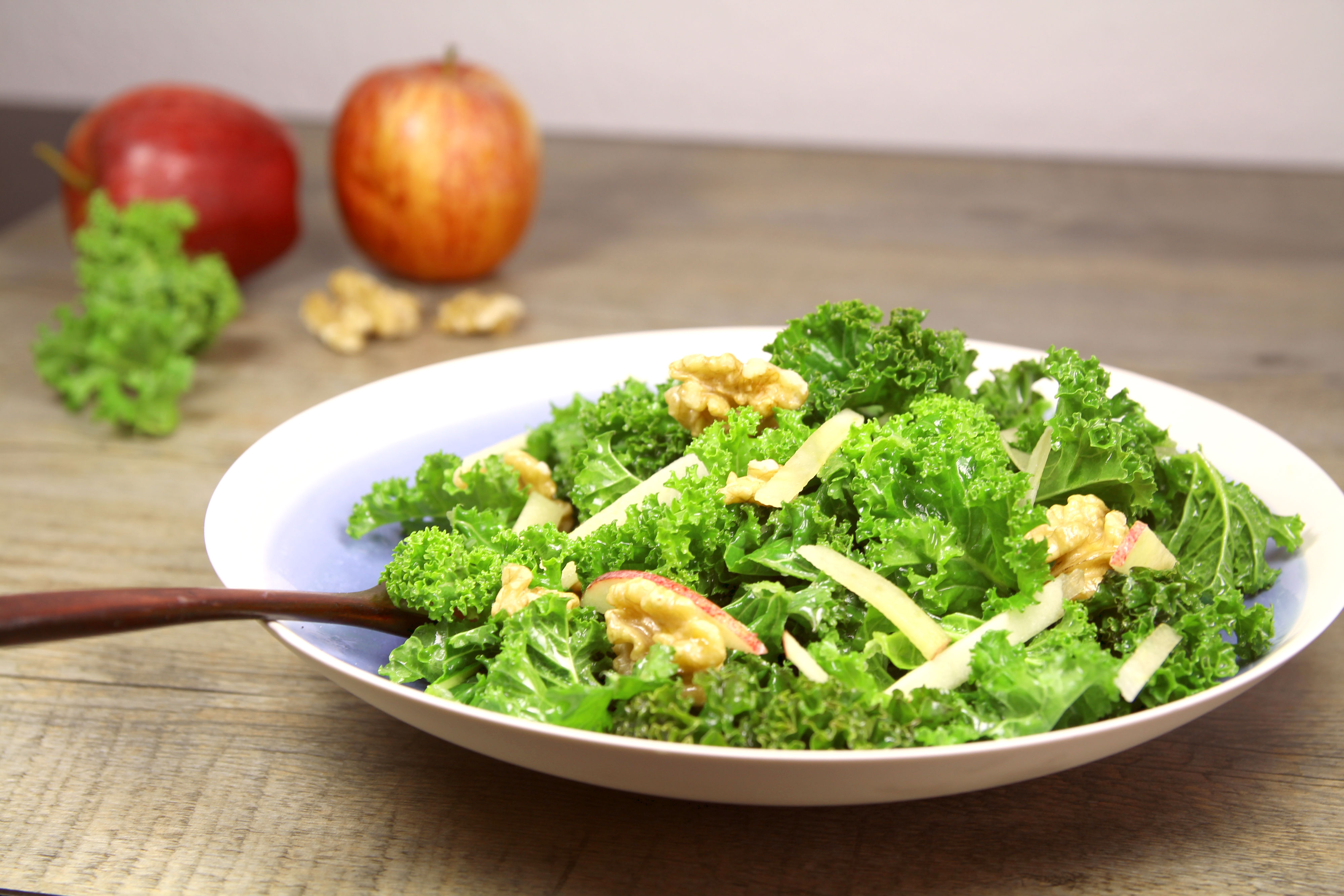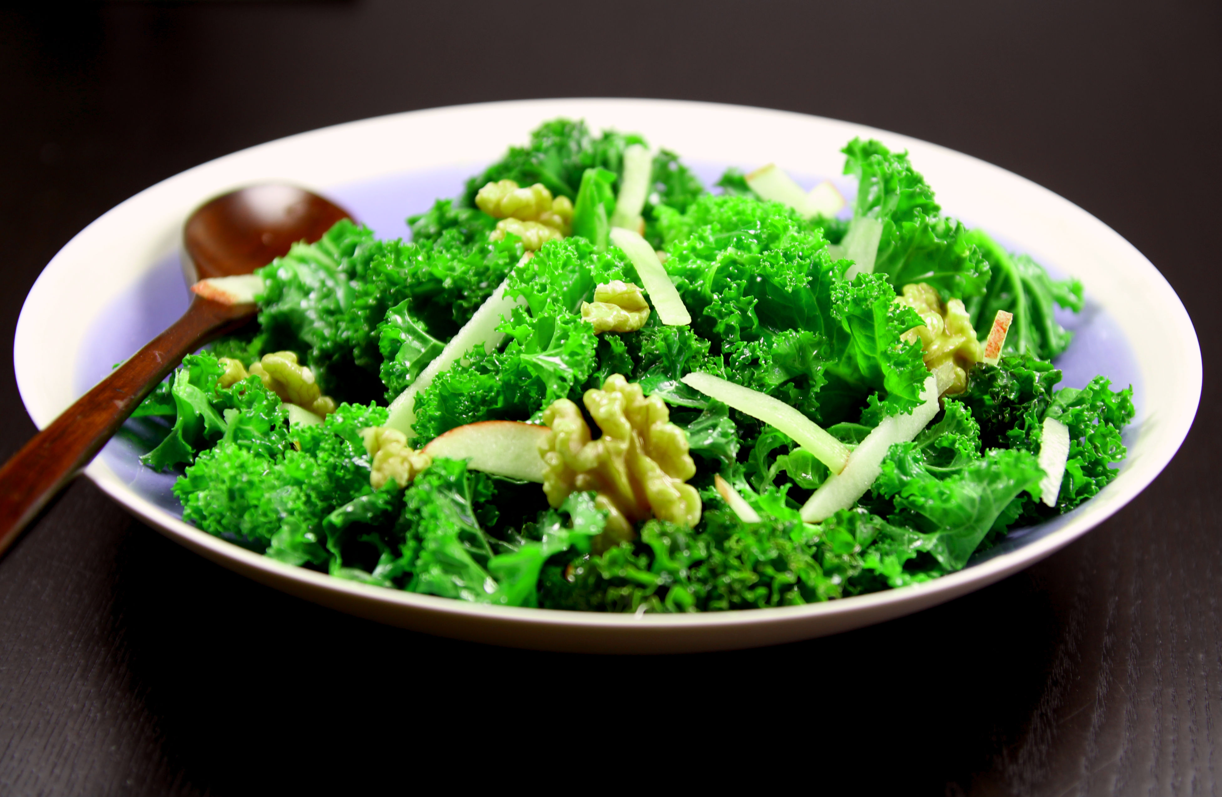 Aujourd’hui je vous propose une salade orginiale, 100% vegan dont je suis devenu fan. J’ai découvert cette salade par hasard chez un traiteur non loin de mon bureau en cherchant des idées et une petite salade « différente et sympa » pour mon repas. Après une bouchée j’étais accro et j’ai voulu refaire cette recette à la maison. Ce qui rend cette salade spéciale c’est bien sûr le chou Kale (que j’ai eu un peu de mal à trouver d’ailleurs) et sa texture « rustique » et son goût. Le chou Kale est une variété ancienne du chou vert dont il existe plusieurs variétés. Ce chou fait déjà depuis quelques temps fureur aux U.S. pour ses propriétés anti-oxydantes, anti-inflammatoires…Je m’arrêterai pour ma part, à ses applications culinaires. On va donc cuisiner le chou Kale dans sa version la plus simple, c’est à dire cru. Il est bien sûr possible de le faire cuire à la poêle, au four, friteuse…Le recette du jour est celle que j’ai dégusté et qui est très simple mais libre à vous d’y ajouter des ingrédients. Pour cette recette j’ai parcouru un peu le net et je me suis inspiré de l’excellent site papillesetpupilles