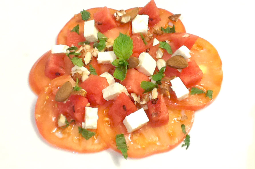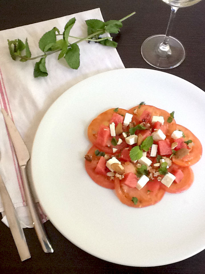 Aujourd’hui une recette estivale avec un mariage original tomate-pastèque. Vous verrez que l’essayer c’est l’adopter tellement cette salade est rafraîchissante et facile à préparer. Comme toujours, il y a peu d’ingrédients dans cette recette donc il est important que ceux-ci aient du goût. C’est pour cela que je vous conseille de faire cette recette l’été car c’est le moment ou les tomates sont les plus goûteuses (j’ai pour ma part utilisé de la rose de Berne)!.