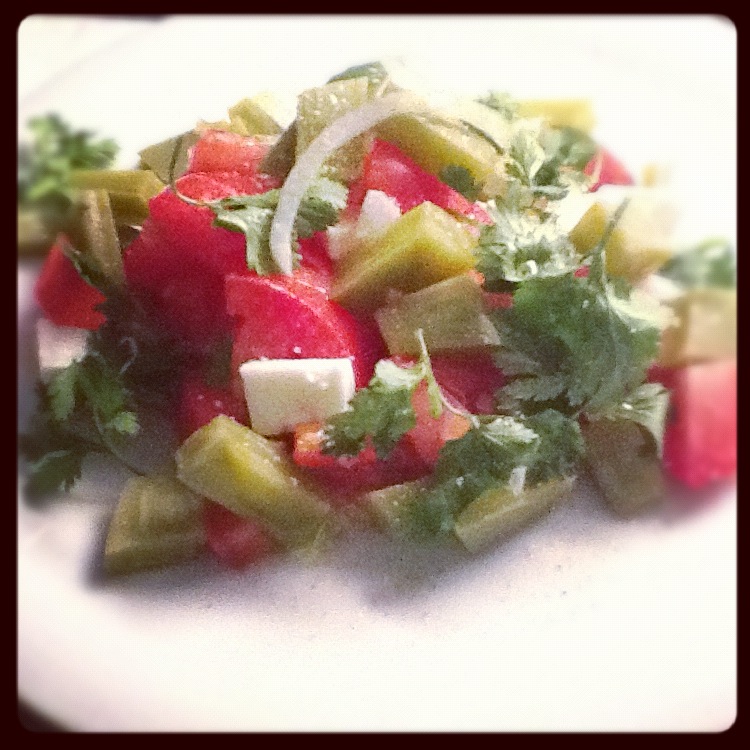 Dans un saladier, réunissez le nopal, les tomates, l’oignon et la coriandre. Assaisonnez de vinaigrette, et servez parsemé de dés de féta grossièrement émiettés.