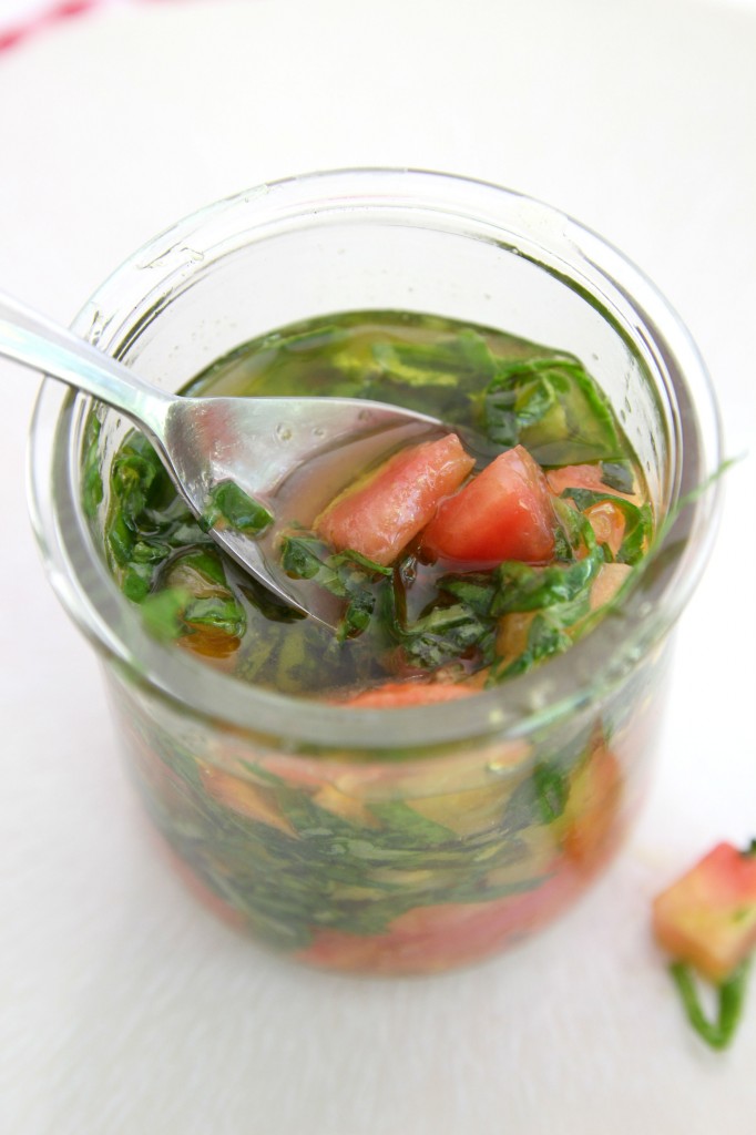 Vous pouvez utilisez cette sauce immédiatement mais je vous conseille de la réserver  au frais 24h afin que les parfums de basilic s’imprègne dans l’huile.