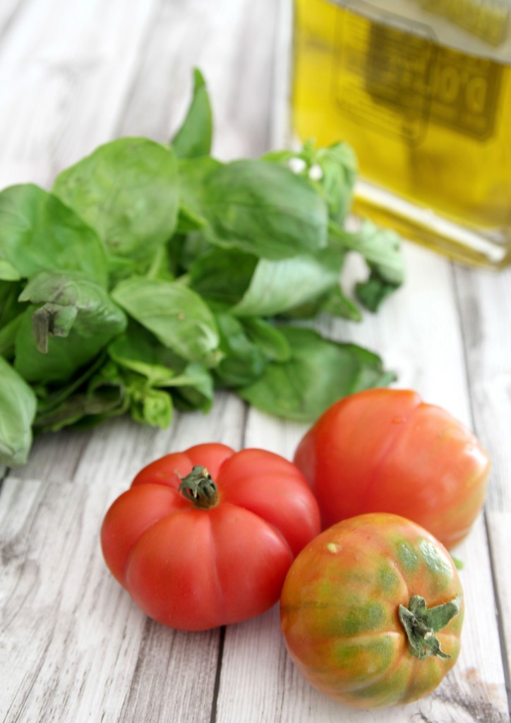 Mettez le basilic dans le bol avec les tomates puis recouvrez le tout d’huile d’olive, assaisonnez de sel et poivre puis mélangez le tout délicatement.