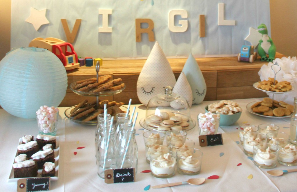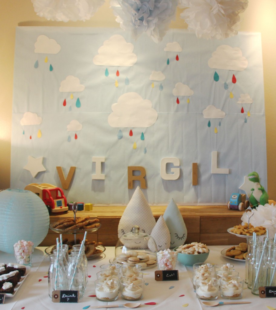 Et voilà, un an s’est déjà écoulé depuis la naissance de notre petit Virgil! J’avais forcément envie de fêter cette date dignement, même si, naturellement, il n’aura sûrement aucun souvenir de cette journée! Après avoir navigué des jours, semaines et mois sur la toile/Pinterest/Instagram, je me suis porté sur un thème nuages et gouttes en prenant comme référence le mobile Butterflying qui trône dans sa chambre ainsi que ma famille Goutte Zü et que j’aime tous les deux d’amour! Ce qui m’a pris le plus de temps en réalité est de penser le thème et les recettes, mais également de trouver les sites qui me permettraient de finaliser ma déco!