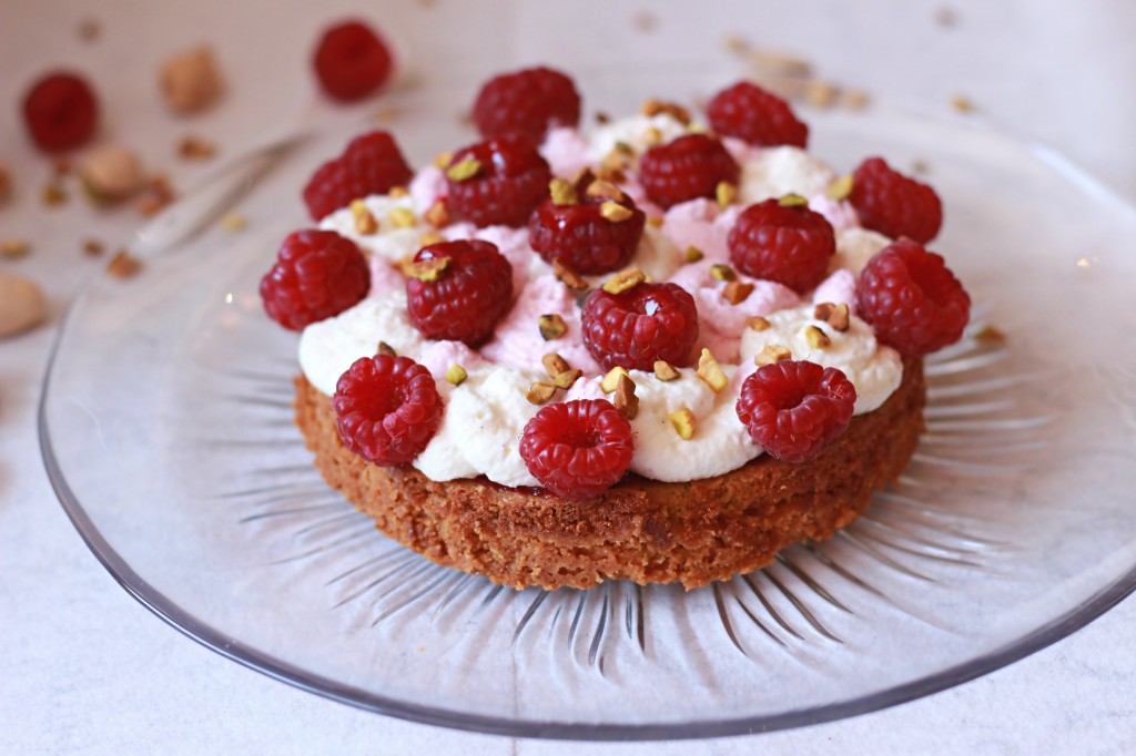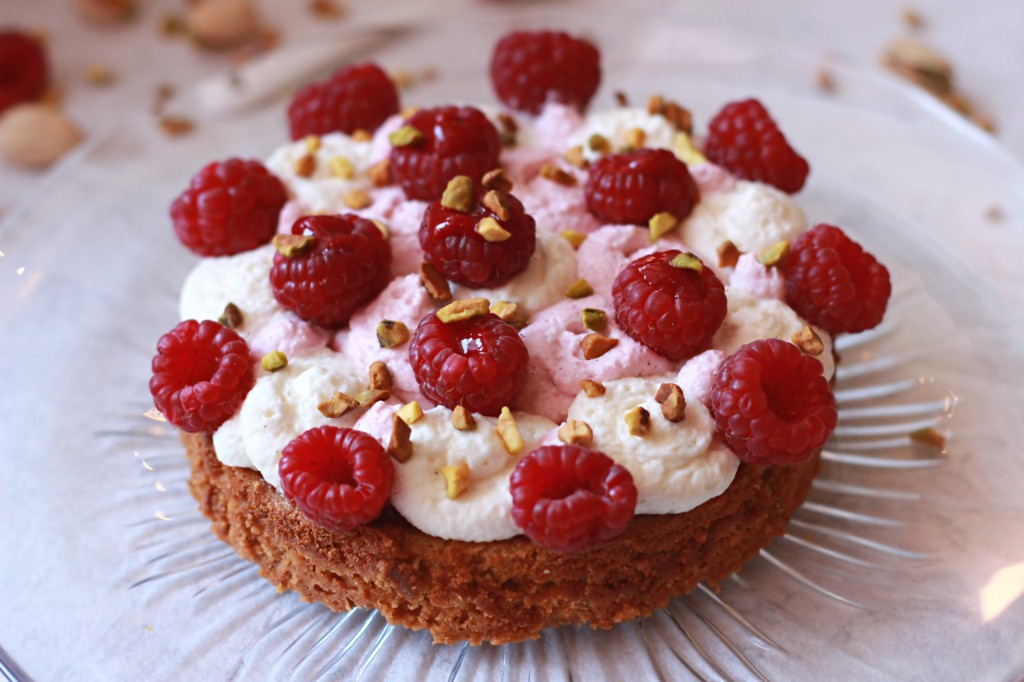 La véritable recette contient, en effet, un confit de fraises (que j’ai remplacé par un coulis de framboises), de la chantilly au chocolat Ivoire et pistache (que j’ai remplacé par une chantilly vanille et une chantilly à la framboise) et des pistaches caramélisées (que j’ai remplacé par des pistaches juste torréfiées).